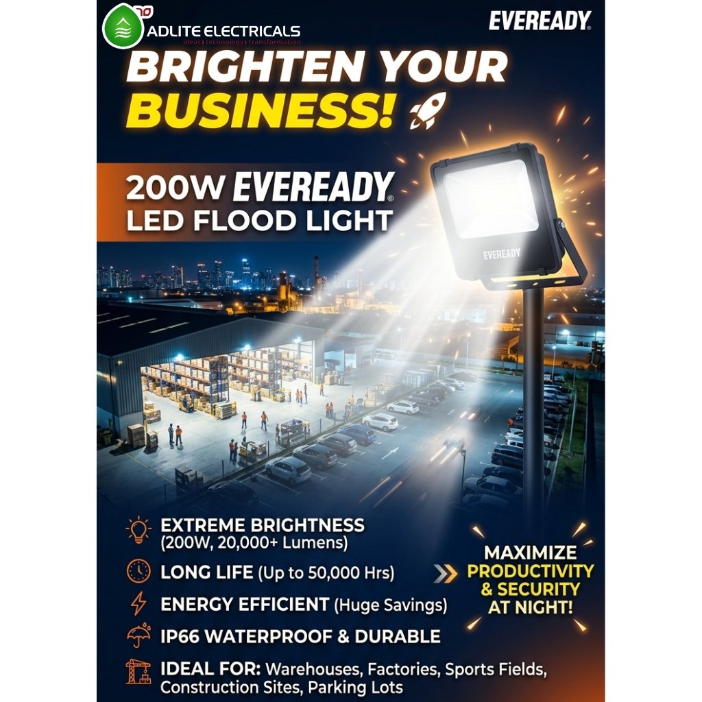 The EVEREADY 200W LED Flood Light is a powerful and efficient lighting solution designed for outdoor area illumination. Built with a single-piece pressure die-cast aluminium housing, dedicated heat sink, and toughened glass, it ensures excellent durability and long-lasting performance even in harsh weather conditions. With its high 200-watt output, this flood light delivers a bright and wide beam, making it ideal for parking areas, industrial premises, landscapes, warehouses, and security lighting. It features an IP66 protection rating for resistance against dust and water, along with IK-07 impact resistance for enhanced strength. The integrated driver comes with 5kV internal surge protection, ensuring stable and reliable operation. Equipped with advanced LED technology, the EVEREADY 200W Flood Light offers superior brightness while consuming less energy, making it a cost-effective and dependable choice for modern outdoor lighting applications.